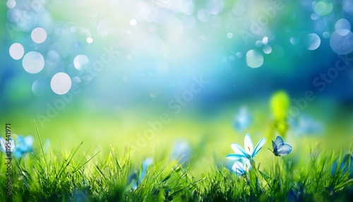 © AI_ALICE, Obraz premium 天気の良い春の日の緑の野原の風景。小さく青い花がが咲くかわいい雰囲気のイラスト画像。AIで生成