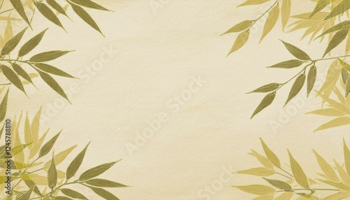 Fototapeta premium ベージュの和紙に緑色の竹林の和風背景壁紙。コピースペースあり。aiで生成