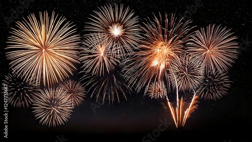 Naklejka premium 夜空に輝く綺麗で美しい打ち上げ花火のイメージ 背景素材 AI生成素材 オレンジ イエロー