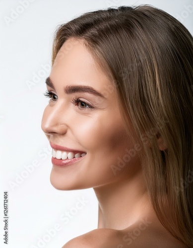 Obraz premium 白く整った美しい歯並びの白人女性の笑顔の横顔クローズアップ。白い背景。AIで生成