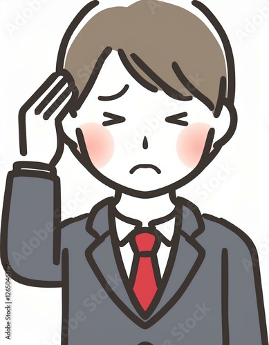 Obraz premium 片頭痛などで頭が痛い男性会社員。頭に手を当てて苦悶の表情をするイラスト。AIで生成