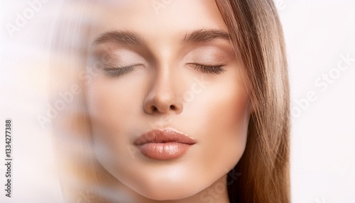 © AI_ALICE, Obraz premium 明るい光を浴びる美しい肌の白人の女性のモデルの目を閉じた顔。aiで生成