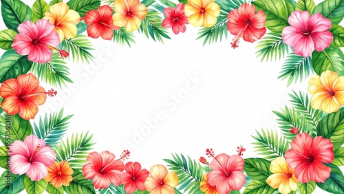 Obraz premium 南国風のフレーム ハイビスカス モンステラ 余白 16:9サイズ AI生成素材