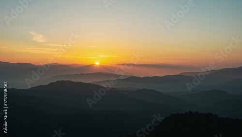 Fototapeta premium 低い太陽が霧の層を透かしながら稜線を縁取り色相の移ろいが上質な印象を残すブランドタイアップにも使いやすいクリーンな朝景.生成AI