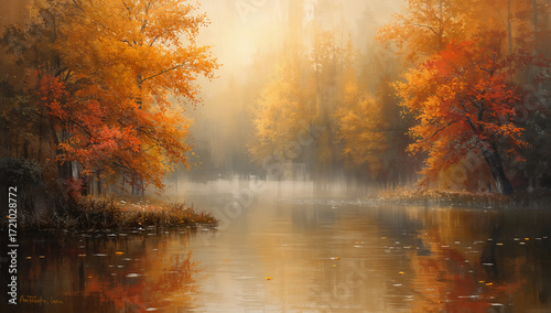 © Ascending Dragon, Obraz premium 黄金色の紅葉が水面に溶け込む穏やかな池畔を印象派のタッチで抽象化し、広告やポスターに適した上質なコピースペースを確保.生成AI