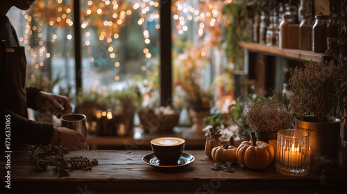 Obraz premium キャンドルとカボチャが彩る秋のカフェ 。AIで生成。
