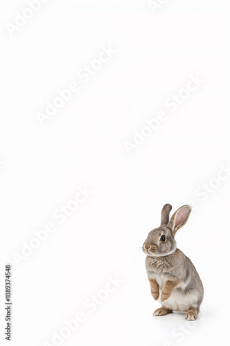 Obraz premium 縦画像向けのかわいい動物、白背景に立つグレーの子うさぎ全身を明るい雰囲気で表現.生成AI