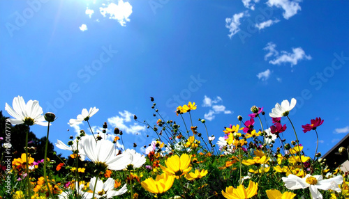 Fototapeta premium 春の花畑 青空 春 フレーム 4月 背景 ai生成画像