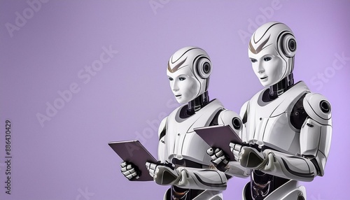 © Diamond Fuji, Fototapeta premium 未来のオフィスワーカー:タブレットを操作する洗練されたAIロボットアシスタント