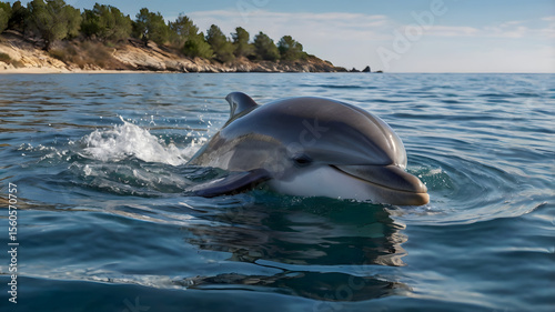 Naklejka premium Ai A curious dolphin swims close to the shore