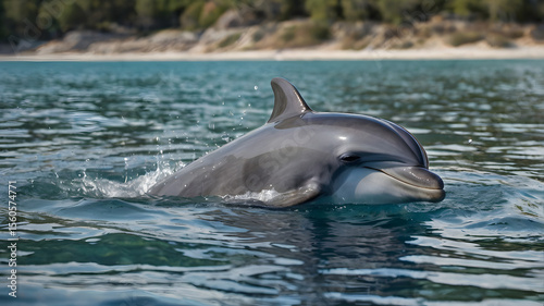 Fototapeta premium Ai A curious dolphin swims close to the shore