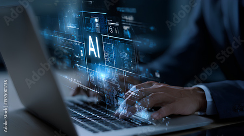 Fototapeta premium AI agent data tools and workflow automation concept with businessman typing on laptop and interacting with digital process interface for artificial intelligence development, integration, productivity