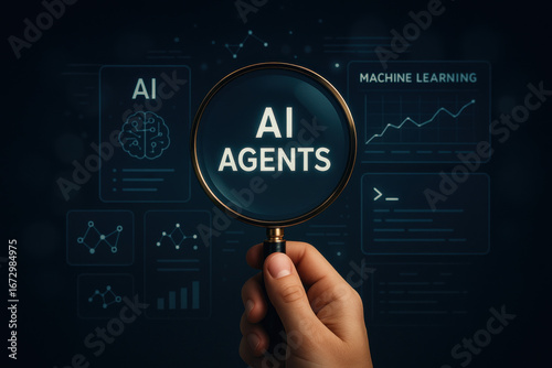 © Somporn, Fototapeta premium AI agents concept with magnifying glass and machine learning data visualization
