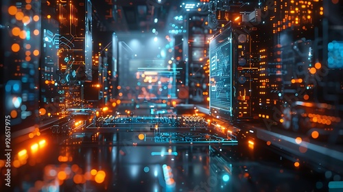 © TranNgoc, Obraz premium AI and quantum computing merging in a futuristic lab, with glowing quantum circuits and real-time algorithm analysis displayed on interactive holographic screens. Created Using: advanced technology,