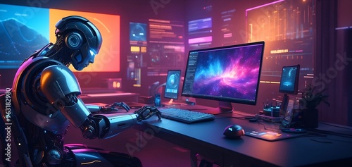 © Govindan maruthai, Fototapeta premium AI. Artificial intelligence. Head robot hanging over podium and look at virtual dashboard. Supercomputer in image futuristic cyborg head. Machine learning technology, neural networks.