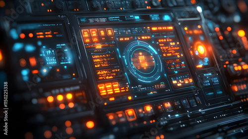 Fototapeta premium AI Assisted Manufacturing Control Panel Glossy Background with Digital Interfaces and Holographic Elements