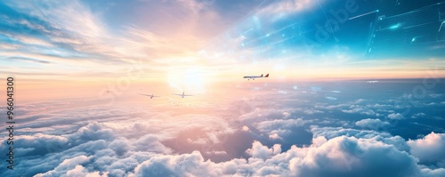 Fototapeta premium AI-based air traffic control, holographic flight paths, digital cloud patterns, open skies