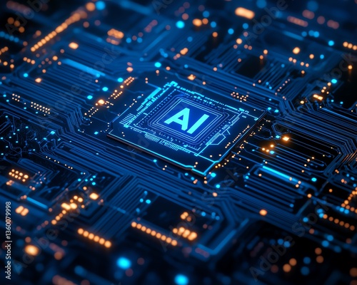 © SUKHUM, Obraz premium AI chip on circuit board. Technology concept.