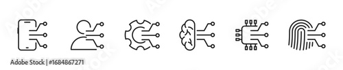 © Tymofii, Obraz premium AI circuits icon set. technology symbol with ai circuits and brain, phone, gear, human, fingerprint and chip. Vector EPS 10