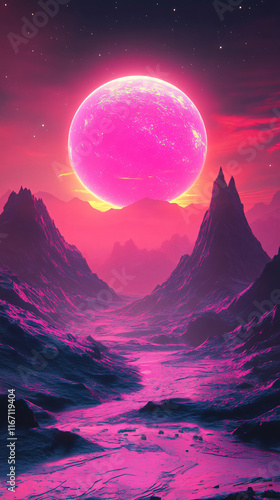 Fototapeta premium AI-created futuristic landscapes with glowing mountains and neon skies.
