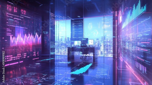 © samrit, Obraz premium AI-created image of a future business office, highlighting profit growth charts and cutting-edge tech