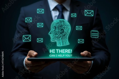 © Mehedi, Fototapeta premium AI Digital Assistant Interface with Futuristic Icons and Human Circuit Head
