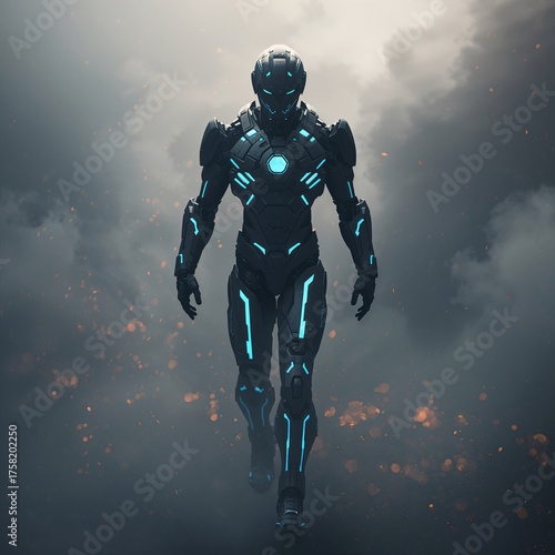 © Ambient Sanctuary, Fototapeta premium AI Exosuit Warrior Emerging from Smoke – Futuristic Cinematic Battle Scene