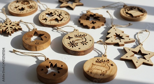© Tran, Obraz premium 木彫りのクリスマスオーナメント 繊細な影が美しい光と影の共演. AI Generated