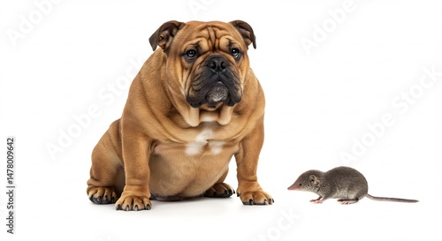 © Do, Obraz premium 愛らしいブルドッグと小さなネズミ 白背景で対比鮮やか撮影. AI Generated