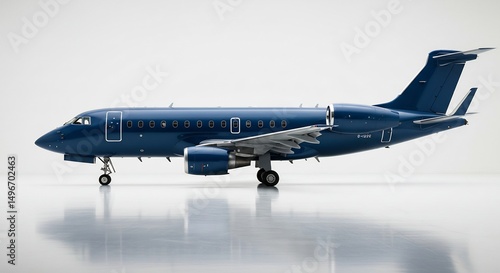 © Tran, Naklejka premium 紺碧のジェット機 滑走路に輝く 上品なシルエット 静寂な朝. AI Generated