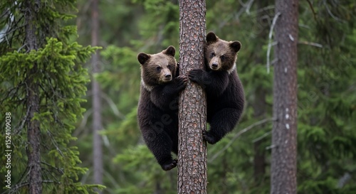 Obraz premium 森深く二匹の子熊 木登り練習 優しい光差し込む. AI Generated