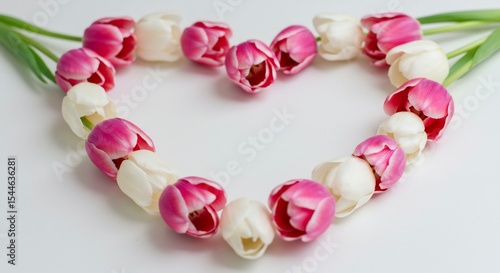Obraz premium 優美な白ピンクのチューリップがハートを描く 柔らかな光で輝く花びら. AI Generated