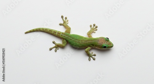 © Nakamura, Fototapeta premium 鮮やか緑色ヤモリ 白い背景で穏やかに這う. AI Generated