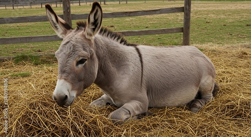 © hitomi, Fototapeta premium 穏やかな日光浴びるロバ、静かに干し草を食べる. AI Generated
