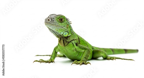 Naklejka premium 緑鮮やかイグアナ 白い背景で輝く瞳 穏やか表情. AI Generated