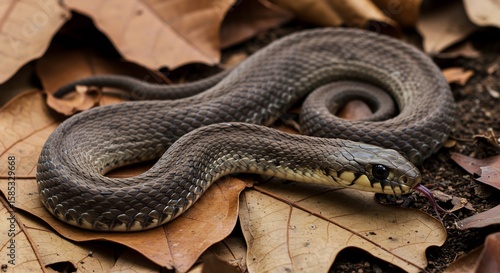 © hitomi, Fototapeta premium 紅葉の中静かに潜む蛇 滑らかな鱗 秋の光彩. AI Generated