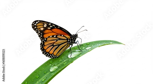 © momoka, Obraz premium 鮮やか羽根 露滴る葉に止まる蝶 優美な姿. AI Generated