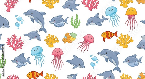 Naklejka premium 元気なイルカとクラゲ 海中模様 鮮やか色彩. AI Generated