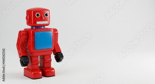 © Tran, Fototapeta premium 赤いレトロロボット 優しく輝く光を浴びて微笑む. AI Generated