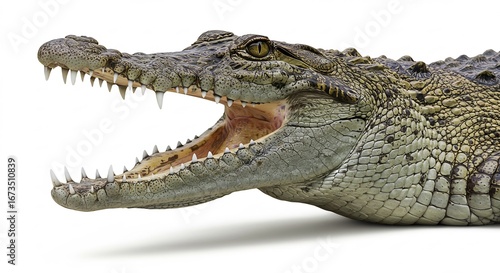 Fototapeta premium 鋭い歯 大きく開けたワニの口 自然光輝く肌. AI Generated