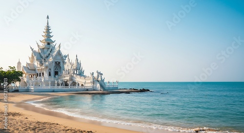 Fototapeta premium 輝く白亜の寺院 海辺に佇む 美しい風景 穏やかな光. AI Generated
