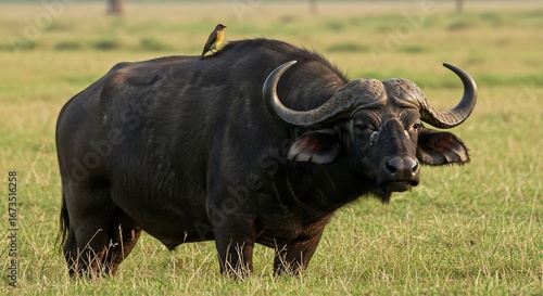 Fototapeta premium 草原に立つ巨大な水牛、穏やかな朝の光浴びて輝く黒毛 小鳥が仲良く乗る. AI Generated