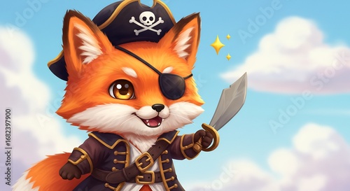 Obraz premium 陽光輝く空 海賊キツネ 可愛い笑顔 冒険始まる. AI Generated