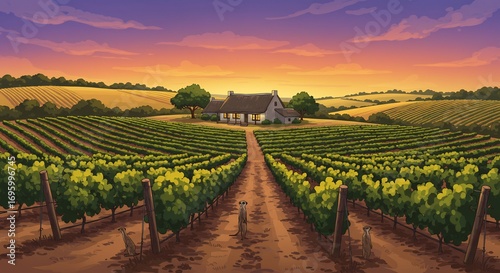 Fototapeta premium 夕日輝く葡萄畑広がる丘陵地帯、静かな農家 美しい風景. AI Generated
