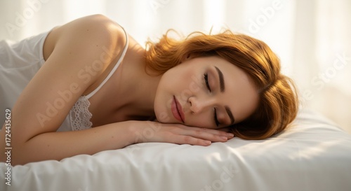 © Rio, Fototapeta premium 穏やか光差し込むベッドで安らかに眠る女性 美しい寝顔. AI Generated