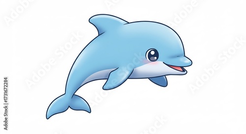 © Tran, Fototapeta premium 白い背景で笑顔で泳ぐ水色の可愛いイルカイラスト優しい光と明るい表情が特徴のキュートな動物デザイン. AI Generated