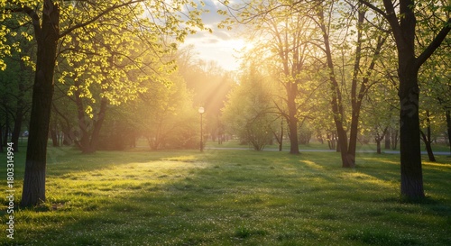 Naklejka premium 眩い木漏れ日が降り注ぐ新緑の森 黄金色の光が美しく輝く早朝の風景. AI Generated