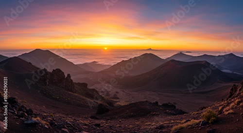 © hitomi, Fototapeta premium ドラマチックな夜明けの空が広がる広大な山岳風景地平線から昇る太陽の黄金色の光が起伏に富んだ山々を鮮やかに照らし幻想的で息をのむような絶景を創り出す. AI Generated