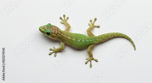 © Tran, Obraz premium 鮮やかな緑のヤモリが明るい白背景に映えるスタジオライトで鮮明に捉えられた高精細な一枚. AI Generated
