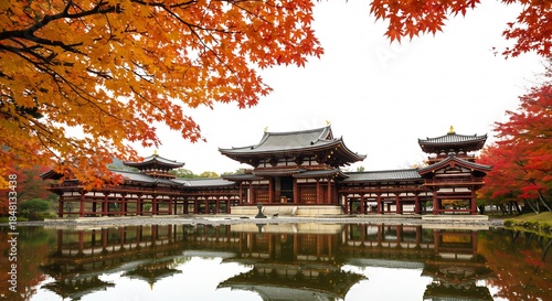 Fototapeta premium 柔らかな光に包まれた日本の歴史ある古刹が色彩豊かな紅葉の木々に囲まれ静かな水面に美しく完璧に映り込む悠久の時を感じさせる秋の絶景. AI Generated